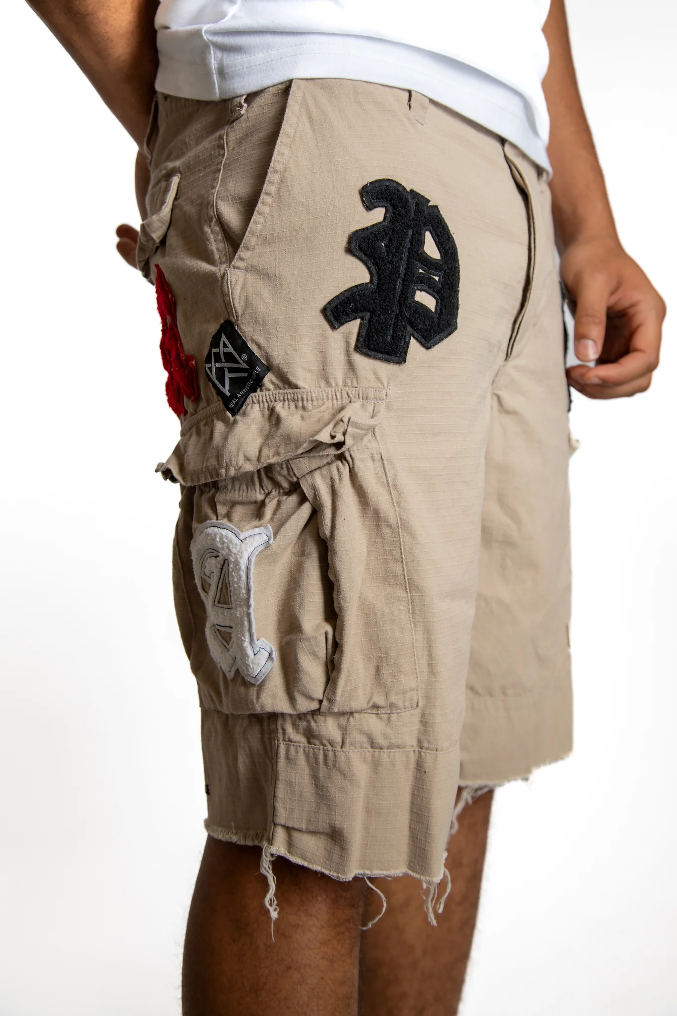 Introducing our unique and environmentally conscious recycled military cargo shorts. Crafted from 100% cotton, these shorts offer a perfect blend of comfort and durability. Each pair is transformed from authentic military cargo pants, expertly repurposed into stylish shorts. To add a touch of personal flair, they are individually hand-painted with intricate designs and feature carefully embroidered rap badges, reflecting the vibrant culture of hip-hop. Embrace sustainability without compromising on style with these one-of-a-kind shorts.100% CottonÂ